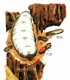 一巢成齡的臺灣乳白蟻,它們的成員有蟻皇、蟻后、兵蟻、工蟻。若蟻等。它們的結構式非常之嚴謹,品級分工清楚,蟻皇授精,蟻后產卵,兵蟻守衛,工蟻覓食勤務,若蟻待成熟長翅,分飛自立成巢。白蟻怕光,喜陰暗潮濕的環境。工蟻外出覓食,將食物消化轉換成養分,喂養巢內各品級白蟻,白蟻個體與個體之間營養均衡,相互清潔身體,相互撫慰,主要造成我們家居破壞的是工蟻——“破壞王”,它們尋找食物的半徑約100米。